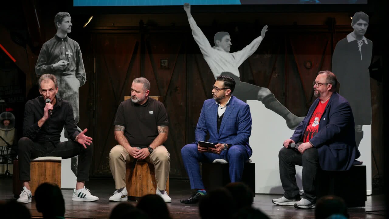 Mirza Demirović (2. v.l.) von der "Nordstadtliga Dortmund" in einer Talkrunde bei der Preisverleihung [Foto: DFB/Getty Images].