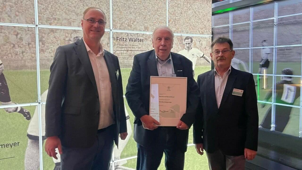 Bevor die Delegierten am Freitag in der Eventhalle des Campus über insgesamt 33 Anträge abstimmen und über die Besetzung der höchsten Ämter im DFB entscheiden, stand am Abend der vergnügliche Teil an. Beim "Get-together" kamen die Delegierten in lockerer Atmosphäre zusammen. Nach der Begrüßung ehrte DFB-Präsident Bernd Neuendorf wichtige Persönlichkeiten aus dem deutschen Fußball. Darunter auch Bernhard Niewöhner, der lange Jahre als Geschäftsführer die Geschicke beim SC Preußen Münster leitete und auch heute noch dem Kreis-Jugend-Ausschuss Münster angehört. Er erhielt die Verdienstspange in Silber.