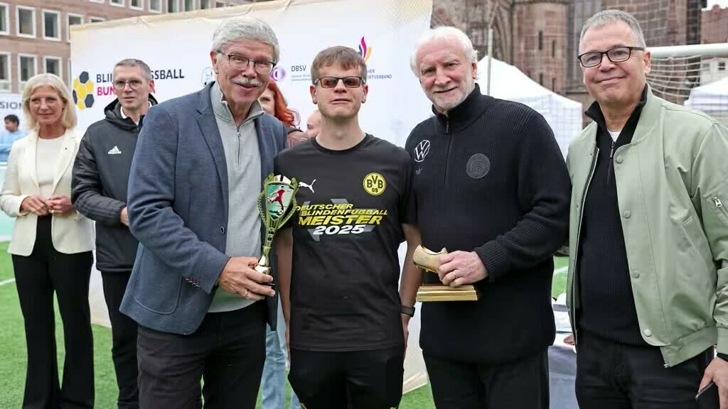 Ein historischer Nachmittag für Borussia Dortmund: Der BVB feiert die erste Deutsche Meisterschaft der Vereinsgeschichte im Blindenfußball. Durch einen 2:0-Erfolg beim Finalspieltag der Blindenfußball-Bundesliga am vergangenen Samstag gegen die SF BG Blista Marburg krönte sich die Borussia zum Meister der Spielzeit 2025. Der Finalspieltag fand im Rahmen der Fußball-Inklusionstage der DFB-Stiftung Sepp Herberger auf dem Hauptmarkt in Nürnberg statt. Mit dabei: DFB-Sportdirektor Rudi Völler.