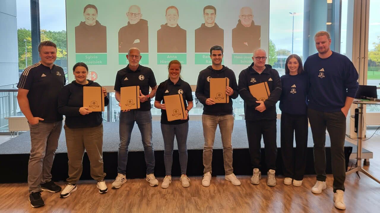 Ausgezeichnet! Diese Club-Berater*innen des FLVW erhielten das Zertifikat: Sylvia Danielsiek, Mathias Deckers, Anna Hieronymus, Ramtin Rad und Achim Schütz (v. l.). Die DFB-Mitarbeiter Andreas Kattenberg (l.), Mara Weber (2. v. r.) und Patrick Bonacker (r.) gratulierten herzlich.