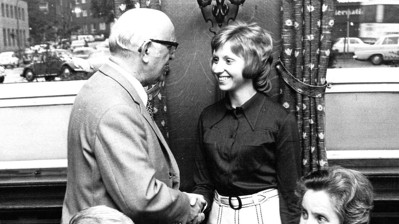 Der frühere Vorsitzende des OSC Dortmund, Walter Doedter, gratuliert Annegret Richter zu ihrem olympischen Staffel-Gold.