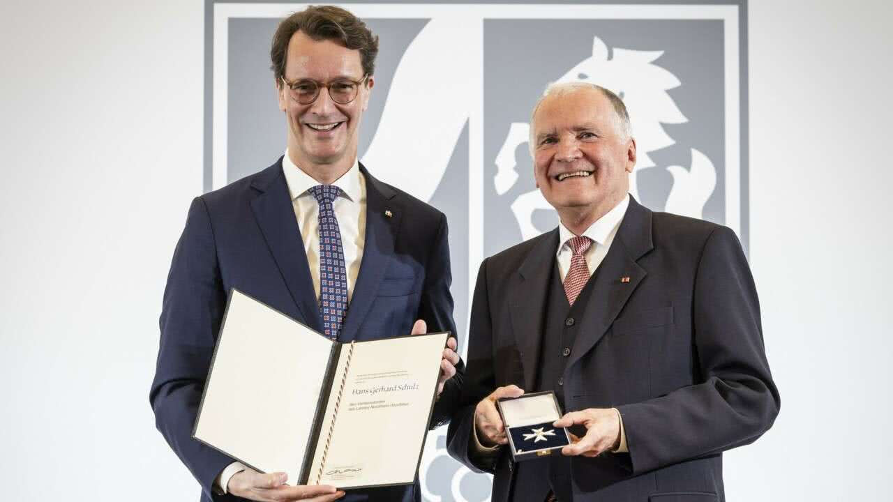 Verleihung des Landesverdienstordens an Hans Schulz durch Ministerpräsident Hendrik Wüst (2024) [Foto: Ralph Sondermann (Staatskanzlei NRW)].