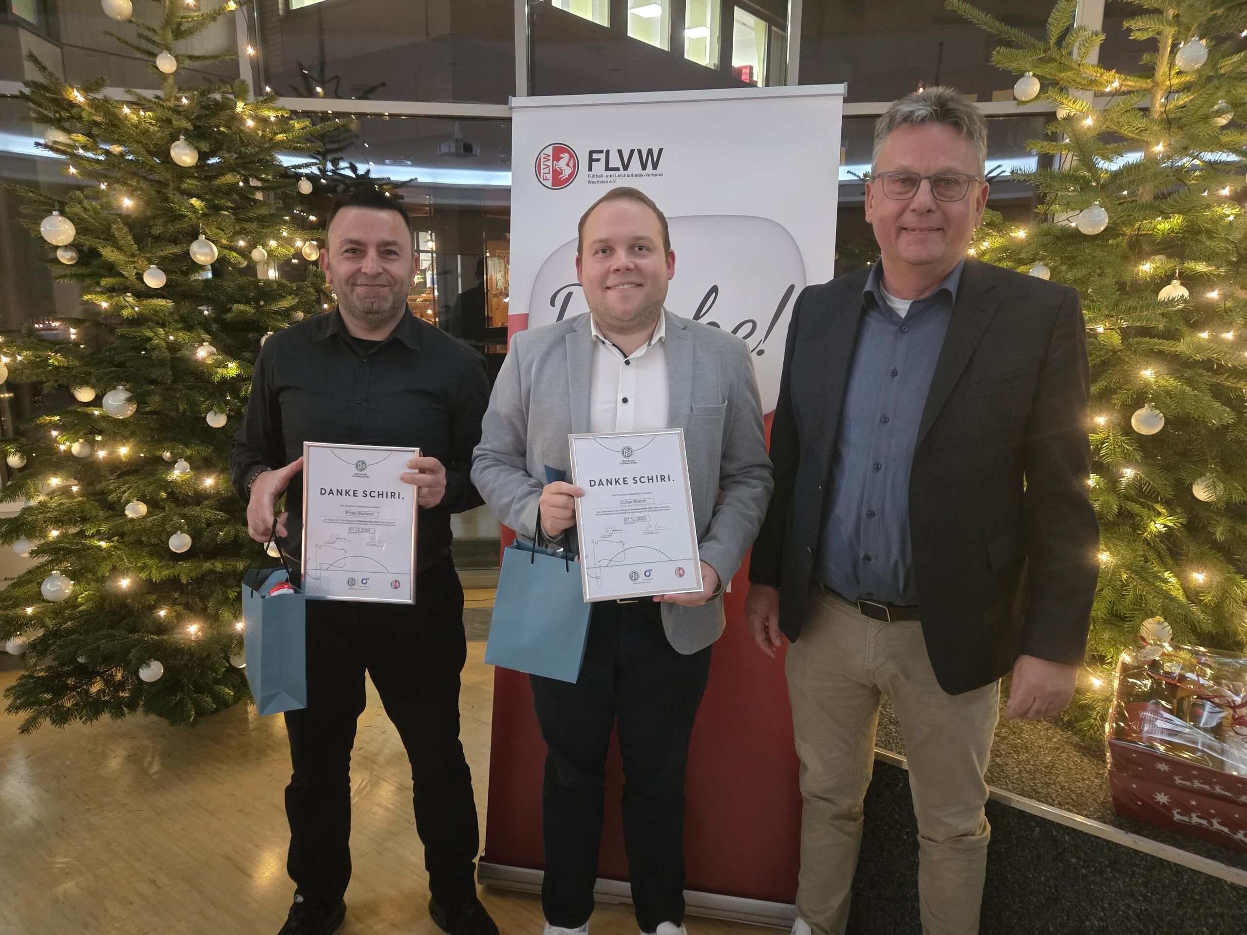 Auch Schiri-Chef Torsten Perschke nutzte die Veranstaltung, um Danke zu sagen, und zwar Danke für besondere Verdienste im Schiedsrichterwesen. Mit der Ehrung von Julian Brandt (SVF Herringen) und Erkan Bostanci (TSC Kamen) wurde die Tätigkeit von zwei Unparteiischen honoriert, die ihren Preis im Rahmen der DFB-Aktion „Danke Schiri“ entgegennahmen.