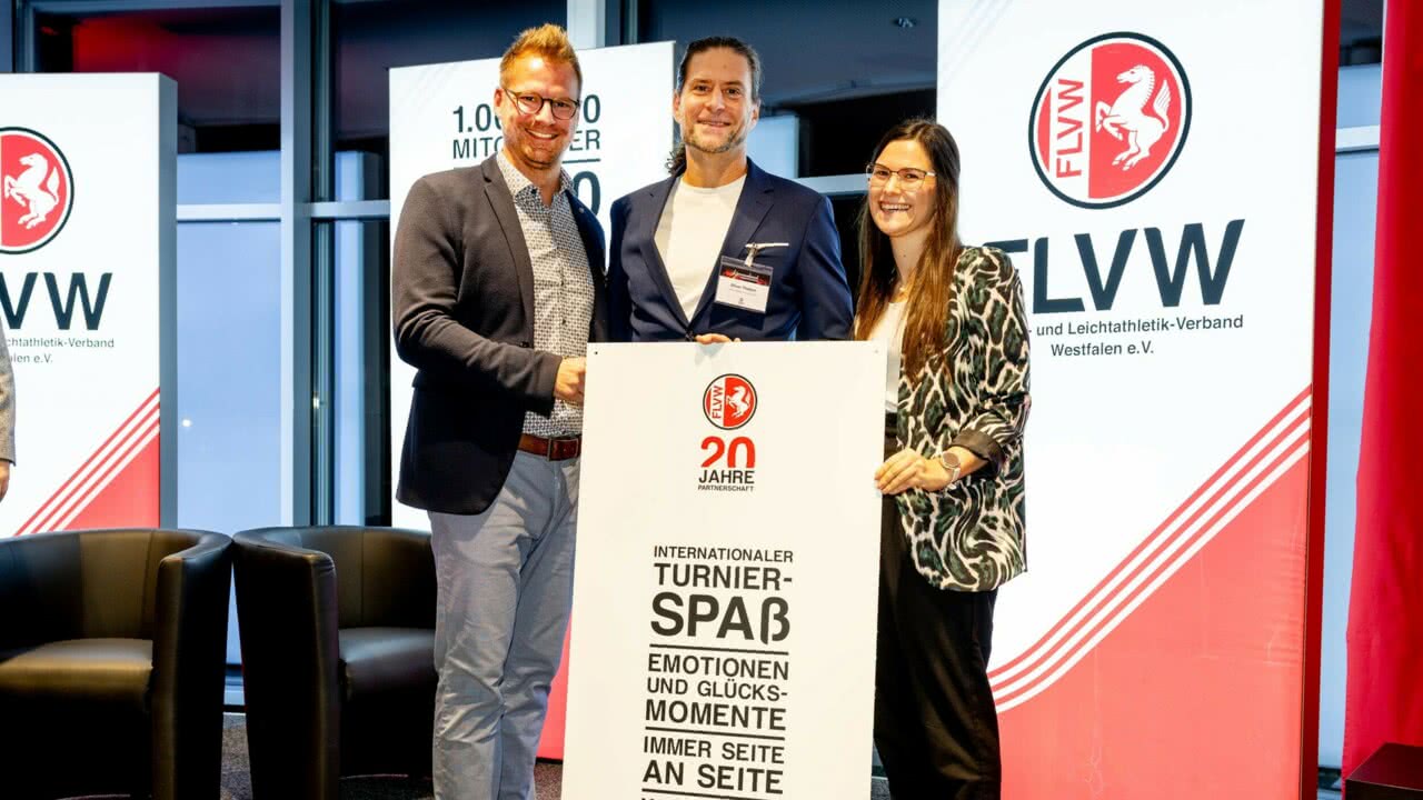Auf eine mehr als 20-jährige erfolgreiche Partnerschaft mit dem FLVW blicken je gleich drei Unternehmen zurück: Oliver Thoben (Sales & Project Manager) von Euro-Sportring, Organisator internationaler Fußballturniere, wurde als erstes auf die Bühne gebeten. In Abwesenheit wurde die adidas Gruppe gewürdigt, die den FLVW seit mehr als zwei Jahrzehnten als Ausrüster unterstützt.