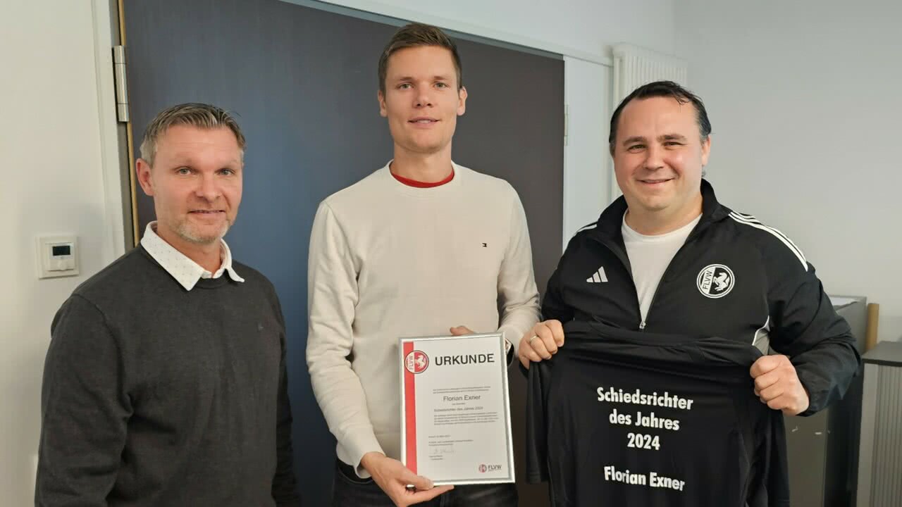 Zu Beginn der Tagung wurde noch eine Ehrung nachgeholt: Die Auszeichnung als „Schiedsrichter des Jahres 2024“ konnte Dr. Florian Exner (Münster) aufgrund seiner vielen Einsätze bislang nur auf virtuellem Wege entgegennehmen. Am Wochenende leitete er zunächst das Spiel der Oberliga Westfalen zwischen Westfalia Rhynern und Victoria Clarholz und hatte am Samstag einen Tag Pause, bevor es am Sonntag als Vierter Offizieller zur Bundesliga-Partie zwischen dem 1. FC Köln und dem Hamburger SV ging. Diese kurze Auszeit nutzte der 35-Jährige, um die Obleute zu besuchen und sich seine Urkunde und ein bedrucktes Trikot als Geschenk auch in Präsenz abzuholen. Exner war im Sommer vergangenen Jahres als Referee in die höchste deutsche Spielklasse aufgestiegen und ist nun neben Sören Storks der zweite westfälische Spitzen-Schiedsrichter in der Bundesliga.
