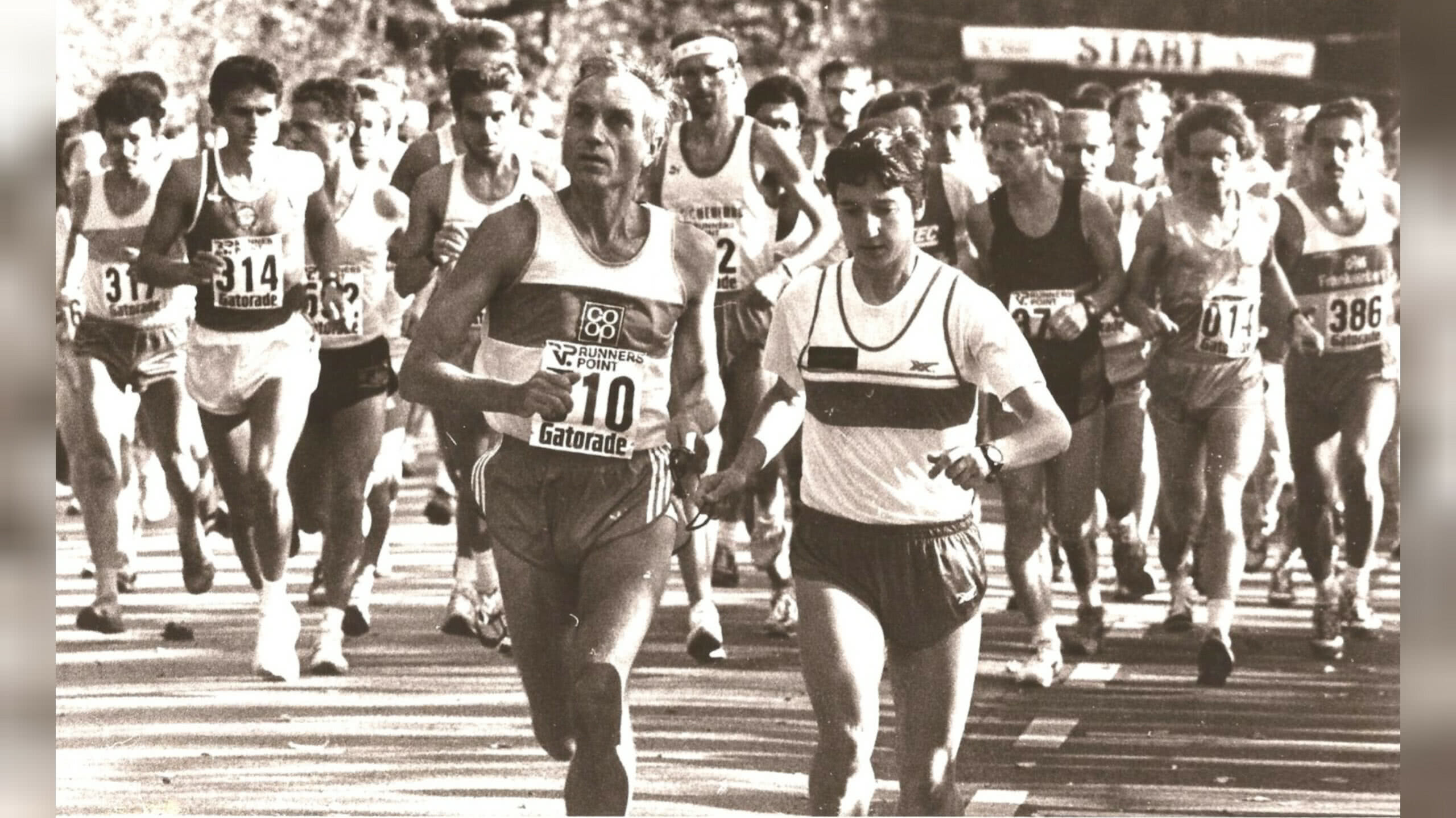 Bei den Deutschen Marathon-Meisterschaften 1976 in Kandel mischte Werner Rathert (Nr. 298) auch bei den Sehenden im vorderen Teil des Feldes mit. Die Schrittmacher-Dienste leistete Peter Middel auf dem Fahrrad.